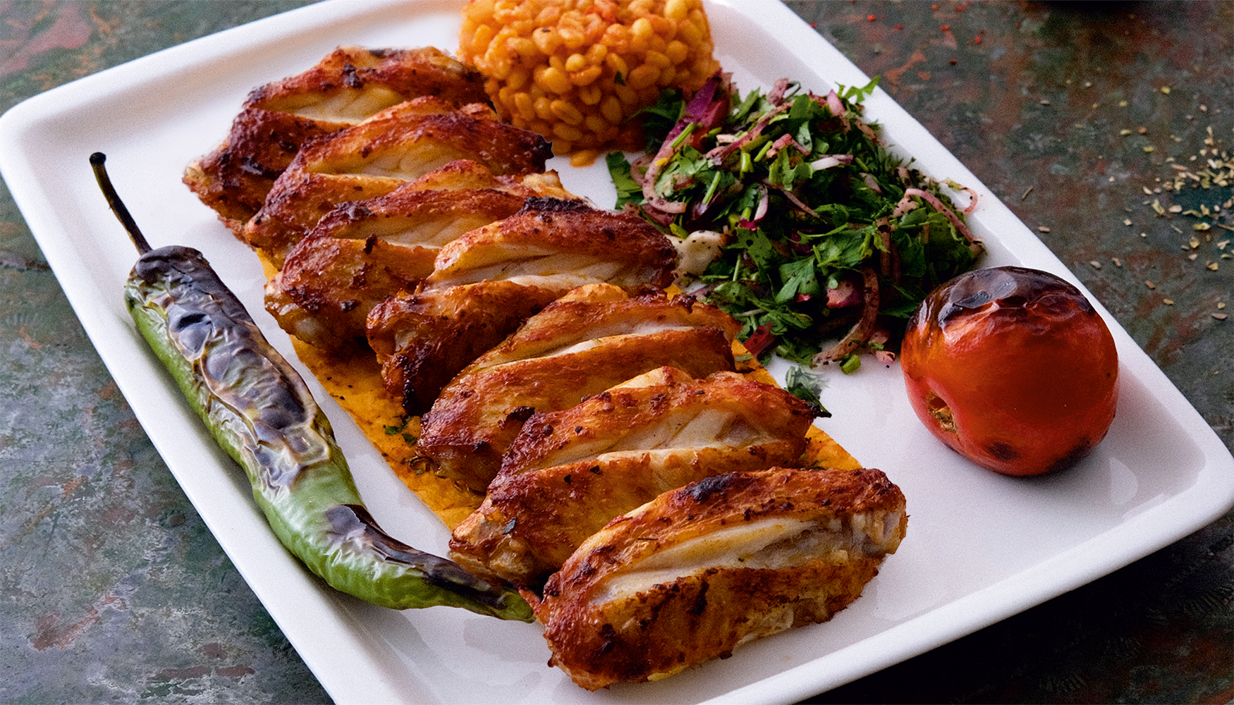 (Közlenmiş Biber, Közlenmiş Domates, Sumaklı Soğan, Bulgur Pilavı Kara Lahana ve lavaş ile servis edilir.)